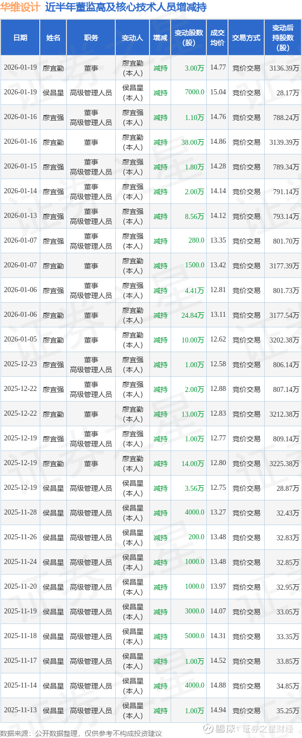华维设计近半年内的董监高及核心技术人员增减持详情如下:
