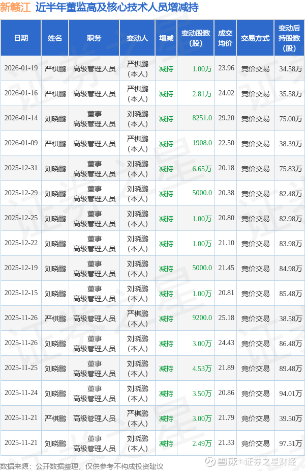 新赣江近半年内的董监高及核心技术人员增减持详情如下: