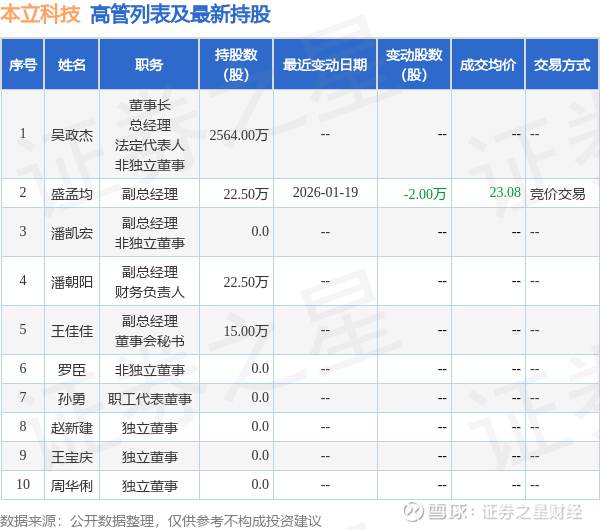 本立科技的高管列表及最新持股情况如下: