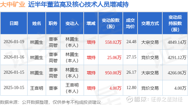 证券之星消息,根据1月20日市场公开信息、上市公司公告及交易所披露数据整理,大中矿业(001203)最新董监高及相关人员股份变动情况:2026年1月19日公司董事,高管林圃生共增持公司股份558.02万股,占公司总股本为0.364%。变动期间公司股价上涨4.49%,1月19日当日收盘报28.42元。