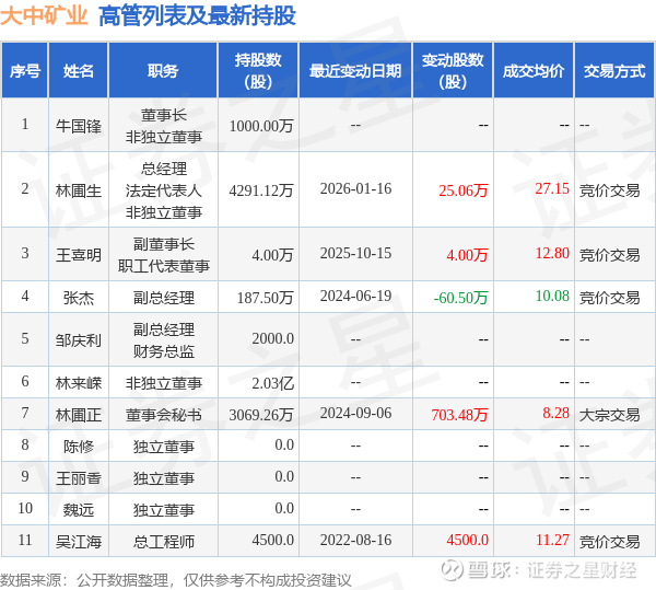 大中矿业近半年内的董监高及核心技术人员增减持详情如下: