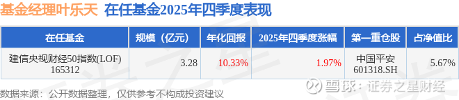 证券之星消息,截止2025年四季度末,基金经理叶乐天管理的建信央视财经50指数(LOF)(165312)季度净值涨1.97%。
