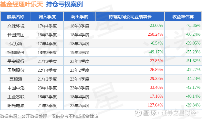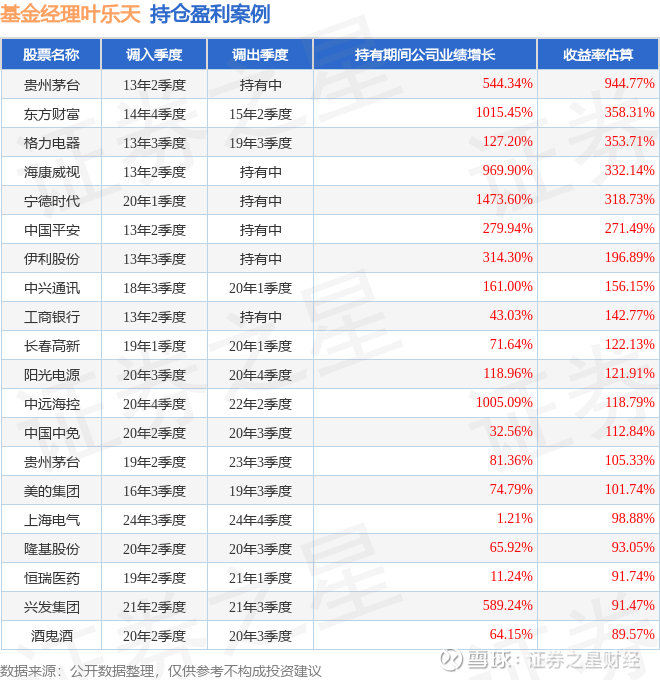 重仓股调仓示例详解:1、贵州茅台(600519)翻倍案例:叶乐天管理的建信央视财经50指数(LOF)基金在13年2季度买入贵州茅台,已连续持有12年又2个季度。持有期间的估算收益率为944.77%,持有期间贵州茅台在2013年到2025年的中报营业总收入增幅达544.34%。2、上海电气(601727)调仓案例:叶乐天管理的建信精工制造指数增强基金在24年3季度买入上海电气,在持有1个季度后在24年4季度卖出。持有期间的估算收益率为98.88%,持有期间上海电气在2023年到2024年的年报营业总收入增幅达1.21%。3、兴源环境(300266)折戟案例:叶乐天管理的建信多因子量化股票基金在17年4季度买入兴源环境,在持有3个季度后在18年3季度卖出。持有期间的估算收益率为-73.86%,持有期间兴源环境在2017年到2018年的年报营业总收入降幅为23.6%。