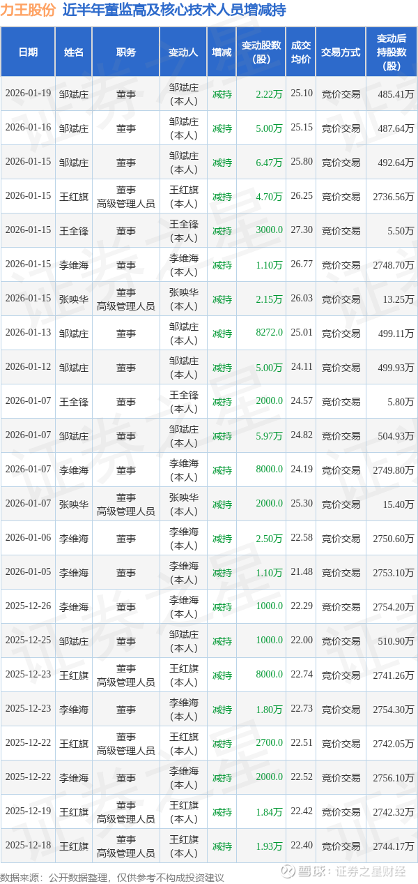 力王股份近半年内的董监高及核心技术人员增减持详情如下:
