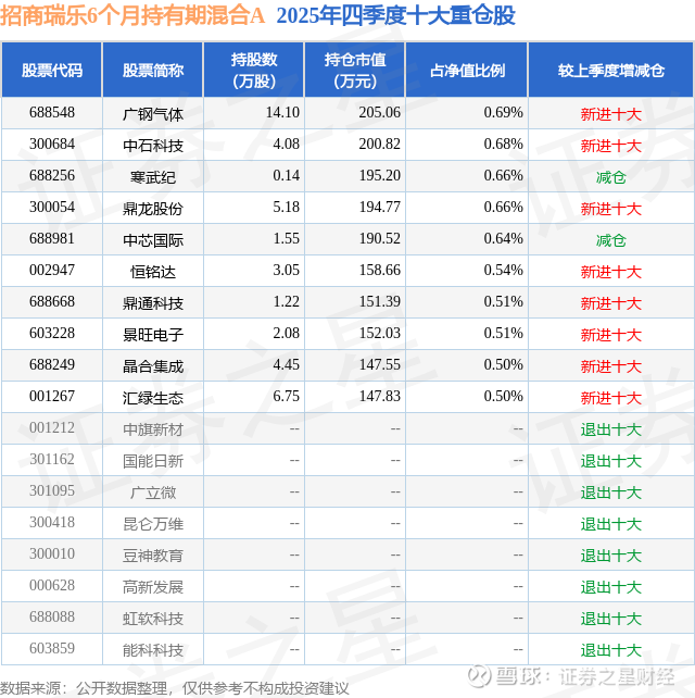 招商瑞乐6个月持有期混合A的前十大重仓股如下: