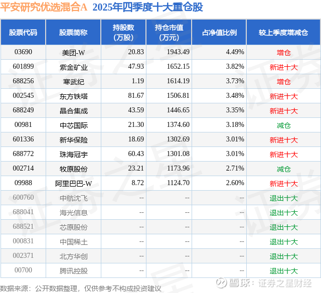 根据2025基金年报公募基金重仓股数据,重仓该股的公募基金共12家,其中持有数量最多的公募基金为平安基金的平安研究优选混合A。平安研究优选混合A目前规模为3.36亿元,最新净值1.4441(1月20日),较上一交易日下跌1.31%,近一年上涨53.82%。该公募基金现任基金经理为张晓泉。张晓泉在任的基金产品包括:平安新鑫先锋A,管理时间为2019年6月14日至今,期间收益率为294.28%;平安研究精选混合A,管理时间为2021年5月25日至今,期间收益率为41.91%;平安新鑫优选混合A,管理时间为2023年8月15日至今,期间收益率为48.47%。