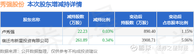 证券之星消息,1月21日秀强股份发布公告《秀强股份:关于持股5%以上股东及其一致行动人减持计划期限届满暨实施情况的公告》,其股东卢秀强、宿迁市新星投资有限公司于2026年1月17日至2026年1月20日间合计减持284.12万股,占公司目前总股本的0.3676%,变动期间该股股价上涨1.93%,截止1月20日收盘报5.8元。