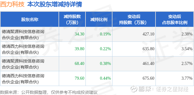 证券之星消息,1月21日西力科技发布公告《西力科技:杭州西力智能科技股份有限公司股东权益变动触及1%刻度及减持股份结果公告》,其股东德清聚源科技信息咨询合伙企业(有限合伙)、德清西力科技信息咨询合伙企业(有限合伙)于2025年12月1日至2026年1月21日间合计减持222.1万股,占公司目前总股本的1.2382%,变动期间该股股价上涨8.31%,截止1月21日收盘报13.56元。