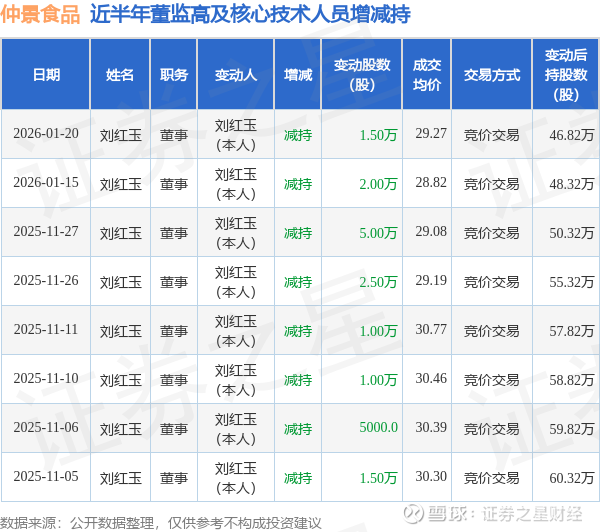 仲景食品近半年内的董监高及核心技术人员增减持详情如下: