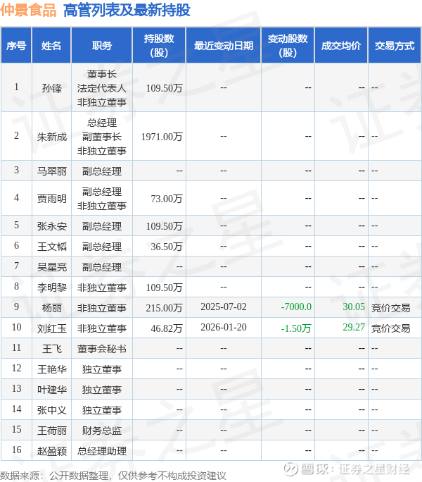 仲景食品的高管列表及最新持股情况如下:
