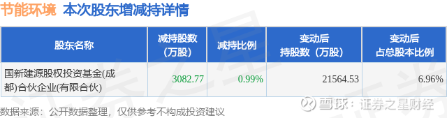 证券之星消息,1月21日节能环境发布公告《节能环境:股东关于减持股份达到或者超过1%的公告》,其股东国新建源股权投资基金(成都)合伙企业(有限合伙)于2026年1月7日至2026年1月20日间合计减持3082.77万股,占公司目前总股本的0.9947%,变动期间该股股价上涨4.11%,截止1月20日收盘报7.34元。