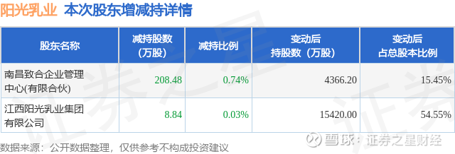 证券之星消息,1月21日阳光乳业发布公告《阳光乳业:关于持股5%以上的股东权益变动触及5%整数倍的公告》,其股东南昌致合企业管理中心(有限合伙)、江西阳光乳业集团有限公司于2025年8月2日至2026年1月20日间合计减持217.32万股,占公司目前总股本的0.7689%,变动期间该股股价下跌3.54%,截止1月20日收盘报15.82元。
