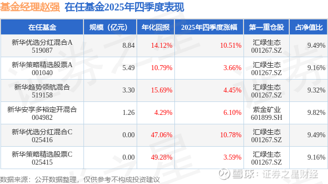 证券之星消息,截止2025年四季度末,基金经理赵强旗下共管理6只基金,本季度表现最佳的为新华优选分红混合C(025416),季度净值涨10.78%。