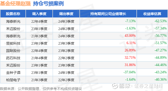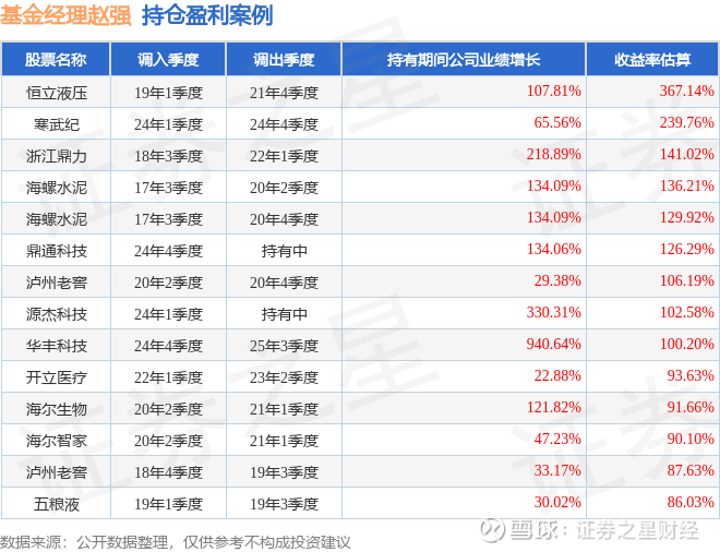 重仓股调仓示例详解:1、恒立液压(601100)翻倍案例:赵强管理的新华策略精选股票A基金在19年1季度买入恒立液压,在持有2年又3个季度后在21年4季度卖出。持有期间的估算收益率为367.14%,持有期间恒立液压在2019年到2021年的年报归属净利润增幅达107.81%。2、开立医疗(300633)调仓案例:赵强管理的新华战略新兴产业灵活配置混合基金在22年1季度买入开立医疗,在持有1年又1个季度后在23年2季度卖出。持有期间的估算收益率为93.63%,持有期间开立医疗在2022年到2023年的年报归属净利润增幅达22.88%。3、海泰新光(688677)折戟案例:赵强管理的新华安享多裕定开混合基金在22年4季度买入海泰新光,在持有1年又3个季度后在24年3季度卖出。持有期间的估算收益率为-62.53%,持有期间海泰新光在2022年到2024年的年报营业总收入降幅为7.13%。