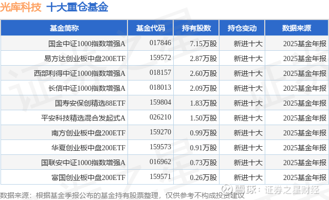 重仓光库科技的前十大公募基金请见下表: