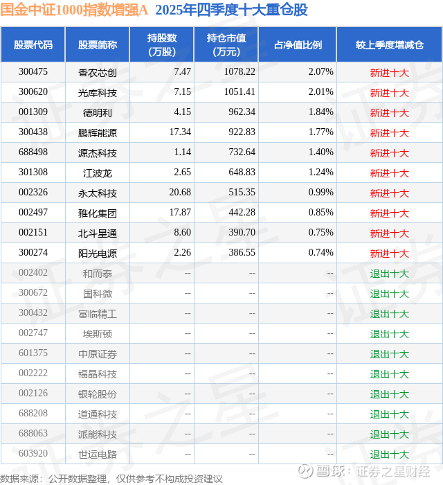 国金中证1000指数增强A的前十大重仓股如下: