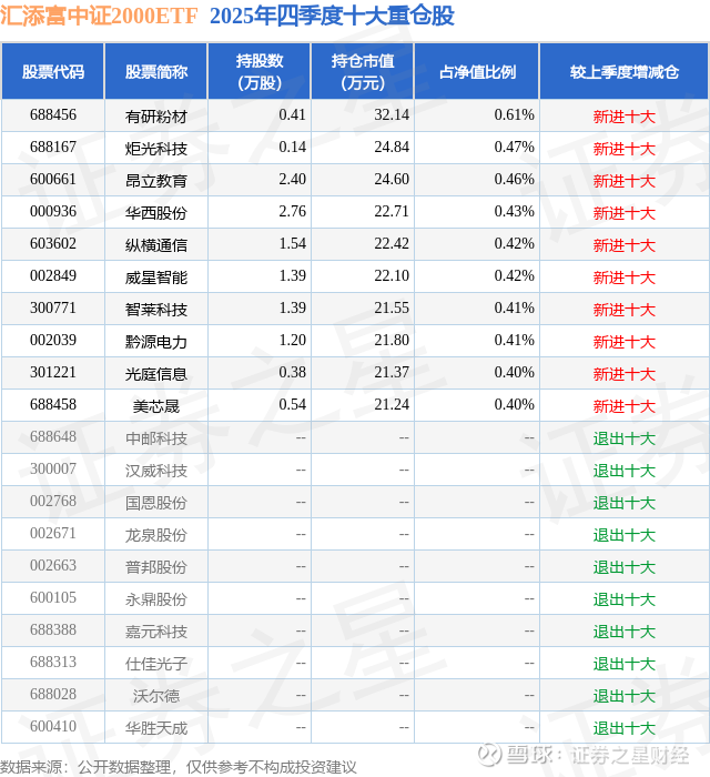 汇添富中证2000ETF的前十大重仓股如下: