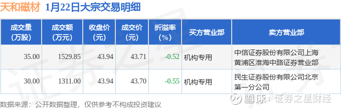 证券之星消息,1月22日天和磁材发生大宗交易,交易数据如下: