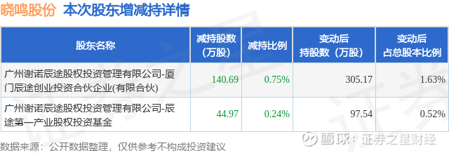 证券之星消息,1月22日晓鸣股份发布公告《晓鸣股份:关于股东及其一致行动人减持计划实施时间届满暨减持结果的公告》,其股东广州谢诺辰途股权投资管理有限公司-厦门辰途创业投资合伙企业(有限合伙)、广州谢诺辰途股权投资管理有限公司-辰途第一产业股权投资基金于2025年10月22日至2025年11月4日间合计减持185.66万股,占公司目前总股本的0.9898%,变动期间该股股价上涨0.43%,截止11月4日收盘报21.0元。