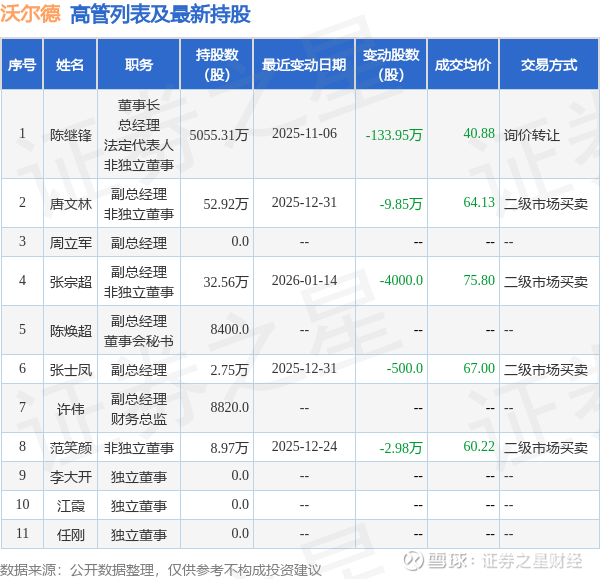 证券之星消息,根据1月22日市场公开信息、上市公司公告及交易所披露数据整理,沃尔德(688028)最新董监高及相关人员股份变动情况:2026年1月20日公司董事,高级管理人员,核心技术人员张宗超、高级管理人员张士凤、董事范笑颜共减持公司股份9500.0股,占公司总股本为0.0062%。变动期间公司股价上涨4.74%,1月20日当日收盘报80.37元。