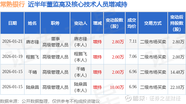 常熟银行近半年内的董监高及核心技术人员增减持详情如下: