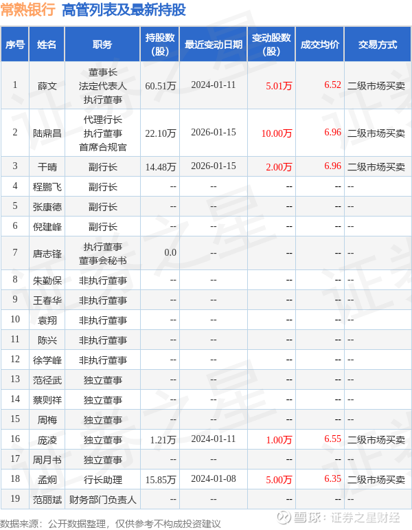 常熟银行的高管列表及最新持股情况如下: