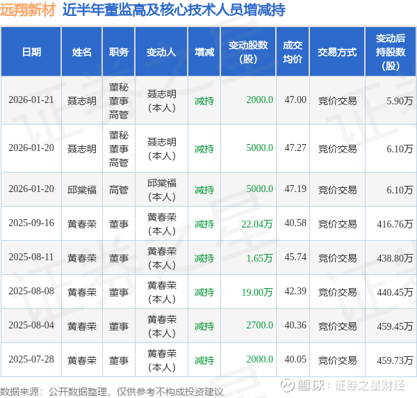远翔新材近半年内的董监高及核心技术人员增减持详情如下: