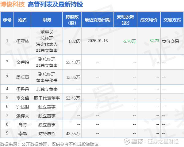 证券之星消息,根据1月22日市场公开信息、上市公司公告及交易所披露数据整理,博俊科技(300926)最新董监高及相关人员股份变动情况:2026年1月21日公司董事,高管伍亚林共减持公司股份165.54万股,占公司总股本为0.3812%。变动期间公司股价上涨0.78%,1月21日当日收盘报32.4元。