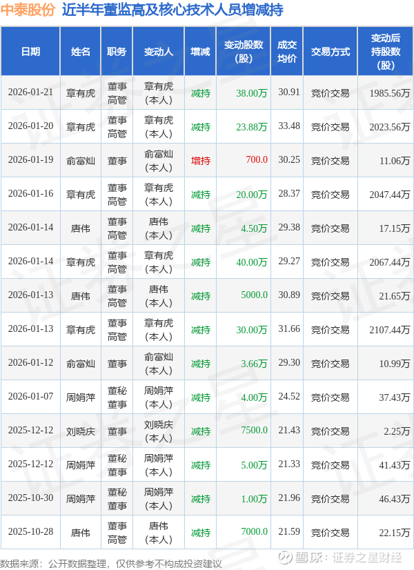 中泰股份近半年内的董监高及核心技术人员增减持详情如下: