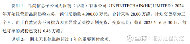 新品牌奶粉业务主要由礼尚信息子公司无限链(香港)有限公司经营。2024年,其预付采购款4900万元,合计采购28万罐,计划交货期为三个月,然而由于自然灾害不可抗力因素导致无法按计划交货,交货延期,截至2025年上半年末,前述订单的奶粉已交付6.48万罐,这也意味着,不仅大部分采购计划未能完成,与之相关的巨额预付款项也面临极高的回收风险,这直接印证并导致了前述数千万元的预付账款减值计提。