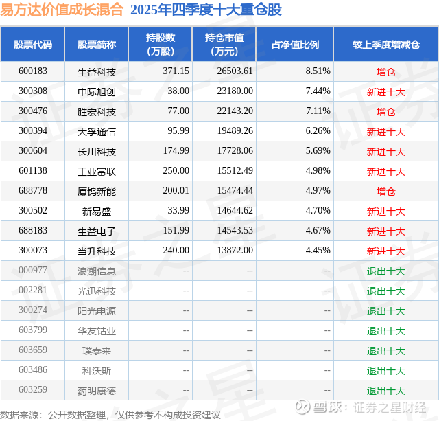 根据2025基金年报公募基金重仓股数据,重仓该股的公募基金共56家,其中持有数量最多的公募基金为易方达基金的易方达价值成长混合。易方达价值成长混合目前规模为31.15亿元,最新净值1.7366(1月22日),较上一交易日上涨1.92%,近一年上涨38.45%。该公募基金现任基金经理为林海。林海在任的基金产品包括:易方达趋势优选混合A,管理时间为2022年3月23日至今,期间收益率为7.1%。