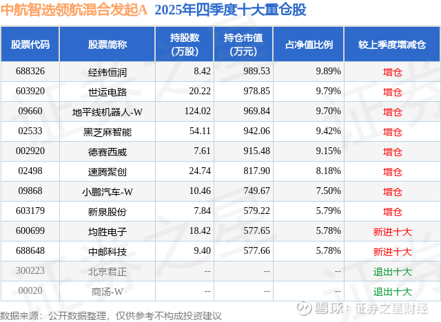 根据2025基金年报公募基金重仓股数据,重仓该股的公募基金共3家,其中持有数量最多的公募基金为中航基金的中航智选领航混合发起A。中航智选领航混合发起A目前规模为0.47亿元,最新净值1.1253(1月22日),较上一交易日下跌1.93%。该公募基金现任基金经理为王森 郑常斌。王森在任的基金产品包括:中航恒宇港股通价值优选混合发起A,管理时间为2023年9月27日至今,期间收益率为19.82%;中航趋势领航混合发起A,管理时间为2024年6月18日至今,期间收益率为211.69%;中航远见领航混合发起A,管理时间为2024年8月30日至今,期间收益率为53.44%;中航优选领航混合发起A,管理时间为2024年12月24日至今,期间收益率为76.36%。