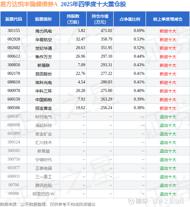 根据2025基金年报公募基金重仓股数据,重仓该股的公募基金共2家,其中持有数量最多的公募基金为易方达基金的易方达悦丰稳健债券A。易方达悦丰稳健债券A目前规模为4.45亿元,最新净值1.086(1月22日),较上一交易日上涨0.05%,近一年上涨5.68%。该公募基金现任基金经理为张雅君。张雅君在任的基金产品包括:易方达磐恒九个月持有混合A,管理时间为2020年8月7日至今,期间收益率为14.28%;易方达宁易一年持有混合A,管理时间为2021年4月9日至今,期间收益率为10.78%;易方达稳泰一年持有混合A,管理时间为2021年4月27日至今,期间收益率为16.92%;