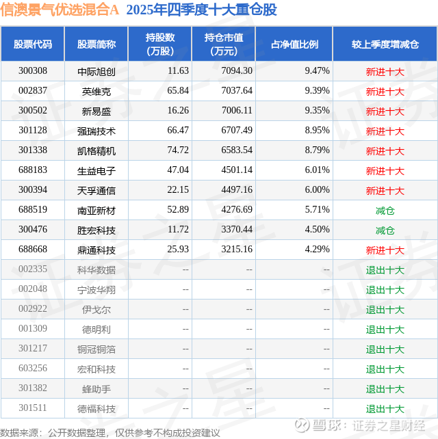 根据2025基金年报公募基金重仓股数据,重仓该股的公募基金共7家,其中持有数量最多的公募基金为信达澳亚基金的信澳景气优选混合A。信澳景气优选混合A目前规模为1.12亿元,最新净值1.8645(1月22日),较上一交易日下跌1.38%,近一年上涨82.63%。该公募基金现任基金经理为吴清宇。吴清宇在任的基金产品包括:信澳优势产业混合A,管理时间为2023年5月29日至今,期间收益率为161.89%;信澳周期动力混合A,管理时间为2024年11月29日至今,期间收益率为76.66%;信澳匠心严选一年持有混合A,管理时间为2024年11月29日至今,期间收益率为120.89%。