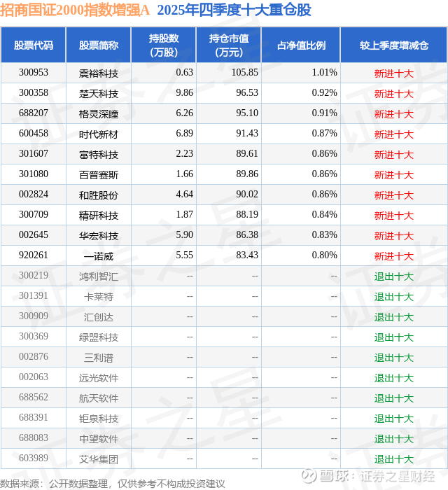 招商国证2000指数增强A的前十大重仓股如下:
