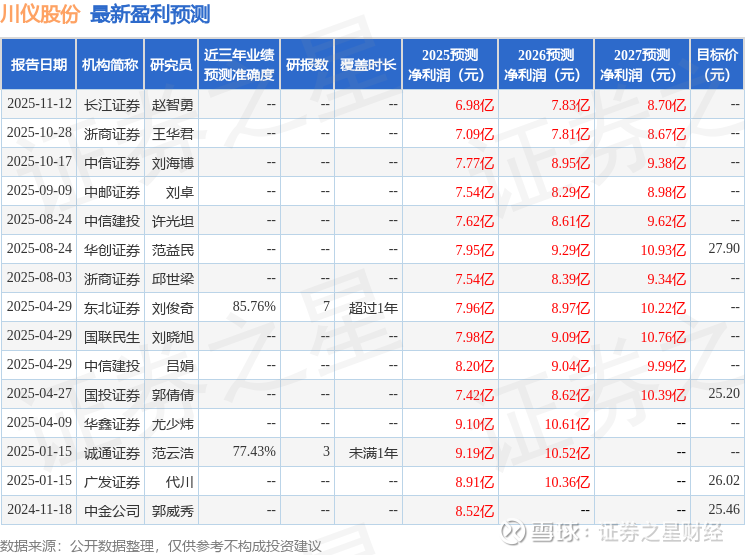 证券之星数据中心根据近三年发布的研报数据计算,东北证券刘俊奇研究员团队对该股研究较为深入,近三年预测准确度均值高达85.76%,其预测川仪股份2025年度归属净利润为盈利7.96亿元,根据现价换算的预测PE为16.28。