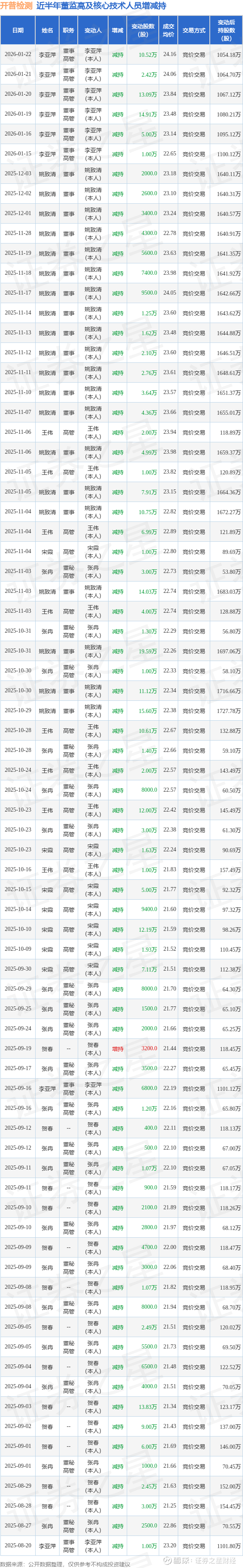 开普检测近半年内的董监高及核心技术人员增减持详情如下: