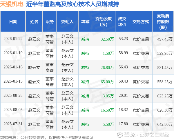 天银机电近半年内的董监高及核心技术人员增减持详情如下: