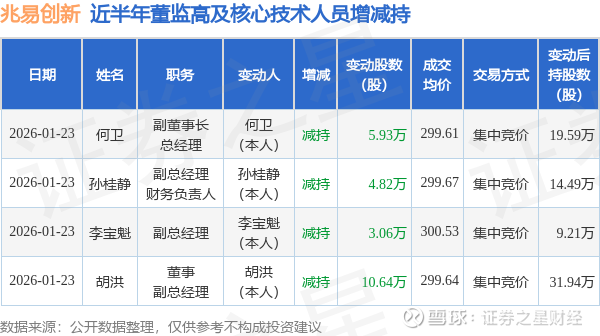 证券之星消息,根据1月23日市场公开信息、上市公司公告及交易所披露数据整理,兆易创新(603986)最新董监高及相关人员股份变动情况:2026年1月23日公司副董事长,总经理何卫、副总经理,财务负责人孙桂静、董事,副总经理胡洪、副总经理李宝魁共减持公司股份24.45万股,占公司总股本为0.0351%。变动期间公司股价下跌1.4%,1月23日当日收盘报297.25元。
