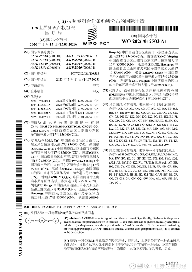 证券之星消息,根据企查查数据显示海思科(002653)公布了一项国际专利申请,专利名为“一种毒蕈碱M4受体激动剂及其用途”,专利申请号为PCT/CN2025/108502,国际公布日为2026年1月15日。