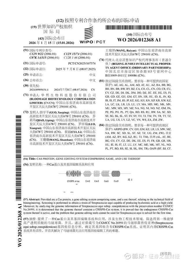 证券之星消息,根据企查查数据显示华熙生物(688363)公布了一项国际专利申请,专利名为“一种Cas蛋白及其基因编辑系统和应用”,专利申请号为PCT/CN2025/107574,国际公布日为2026年1月15日。