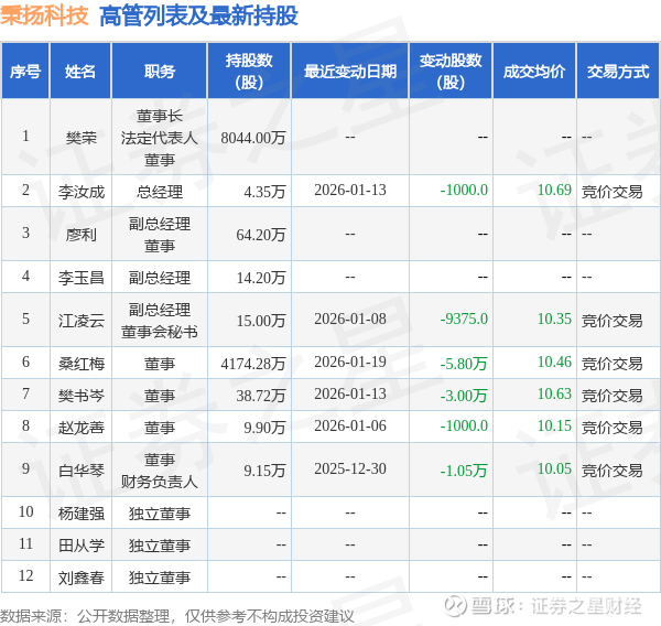 证券之星消息,根据1月24日市场公开信息、上市公司公告及交易所披露数据整理,秉扬科技(920675)最新董监高及相关人员股份变动情况:2026年1月22日公司高级管理人员李汝成、董事,高级管理人员廖利、董事桑红梅、董事赵龙善共减持公司股份32.64万股,占公司总股本为0.1896%。变动期间公司股价上涨4.94%,1月22日当日收盘报11.05元。