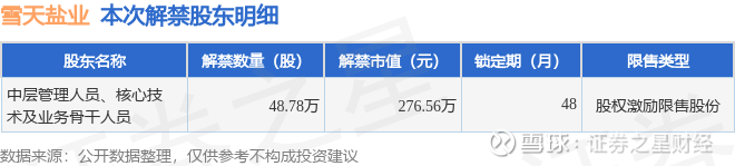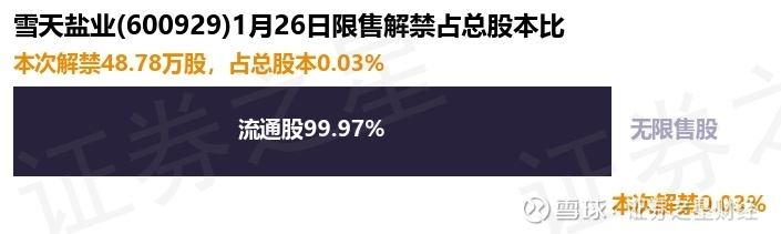 证券之星消息,根据市场公开信息整理,雪天盐业(600929)于1月26日将有48.78万股限售股份解禁,为公司股权激励限售股份,占公司总股本0.03%。(本次数据根据历史公告整理得出,实际情况以上市公司最新公告为准)最近一年内,该股累计解禁291.51万股,占总股本的0.18%。本次解禁后,公司已无限售股份。具体如下图所示:
