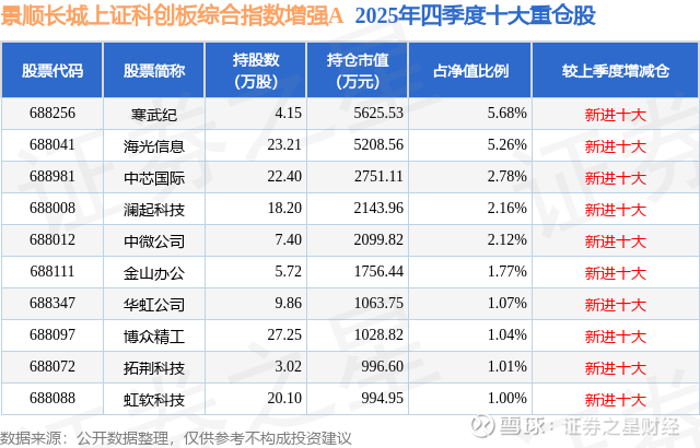 景顺长城上证科创板综合指数增强A的前十大重仓股如下: