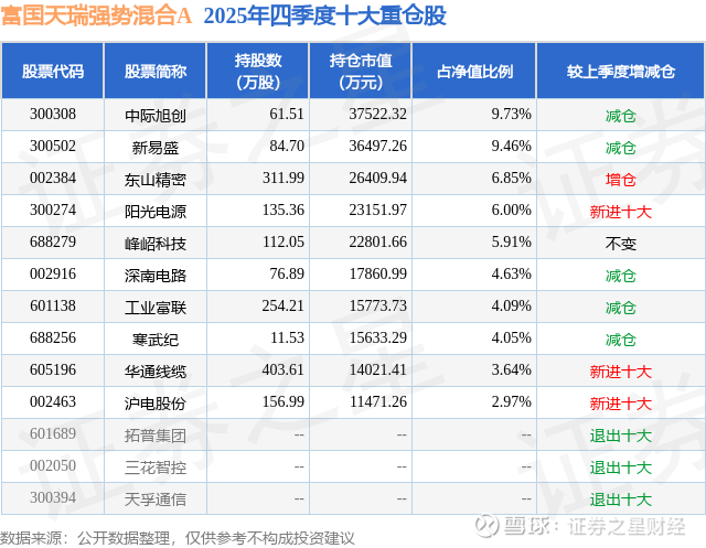 根据2025基金年报公募基金重仓股数据,重仓该股的公募基金共33家,其中持有数量最多的公募基金为富国基金的富国天瑞强势混合A。富国天瑞强势混合A目前规模为38.44亿元,最新净值1.0929(1月23日),较上一交易日下跌0.65%,近一年上涨48.77%。该公募基金现任基金经理为徐智翔。徐智翔在任的基金产品包括:富国新材料新能源混合A,管理时间为2021年11月4日至今,期间收益率为51.04%;富国匠心成长混合A,管理时间为2024年4月30日至今,期间收益率为165.07%。