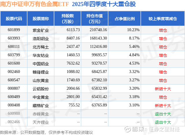 南方中证申万有色金属ETF的前十大重仓股如下:
