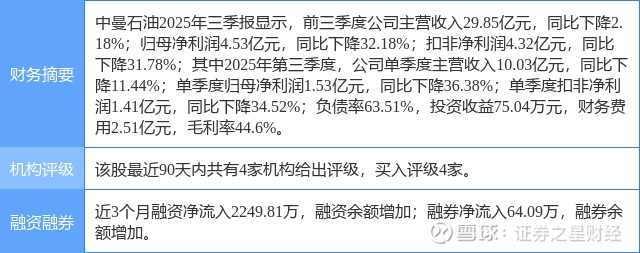 2025年11月1日,信达证券研究员刘红光,胡晓艺发布了对中曼石油的研报《Q3利润环比改善,海外新项目稳步推进》,该研报对中曼石油给出“买入”评级。研报中预测公司2025-2027年归母净利润分别为5.96、7.33和9.87亿元,同比增速分别为-17.9%、+23.0%、+34.6%,EPS分别为1.29、1.59和2.13元/股,按照2025年10月31日A股收盘价对应的PE分别为16.26、13.22和9.82倍,PB分别为2.17、1.92、1.64倍。考虑到公司受益于油气产量快速增长,2026-2027年公司有望继续保持良好业绩,我们维持对公司的“买入”评级。证券之星数据中心根据近三年发布的研报数据计算,该研报作者对此股的盈利预测准确度为52.61%。