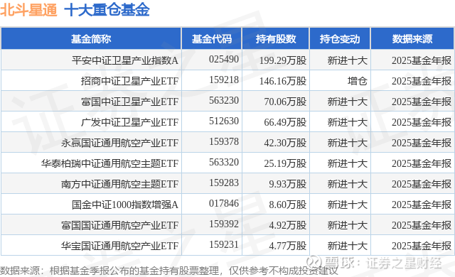 根据2025基金年报公募基金重仓股数据,重仓该股的公募基金共21家,其中持有数量最多的公募基金为平安基金的平安中证卫星产业指数A。平安中证卫星