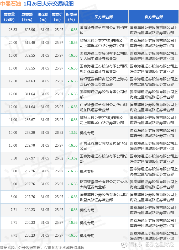 证券之星消息,1月26日中曼石油发生大宗交易,交易数据如下: