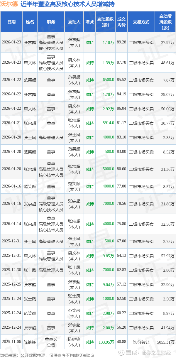 沃尔德近半年内的董监高及核心技术人员增减持详情如下: